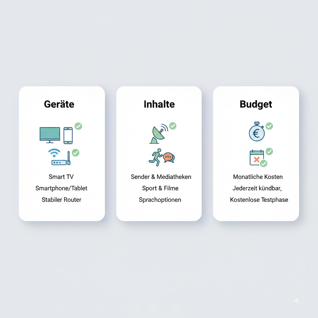 Wenn du es dir leicht machen willst, nutze diese kleine Entscheidungsmatrix: Gerät zuerst, dann Inhalte, dann Abo-Sicherheit. So filterst du 80 % der schlechten Optionen in wenigen Minuten raus. Am Ende geht es nicht darum, den „perfekten“ Anbieter zu finden – sondern den, der bei dir zu Hause stabil läuft, leicht zu bedienen ist und dich nicht in ein unflexibles Abo drückt.