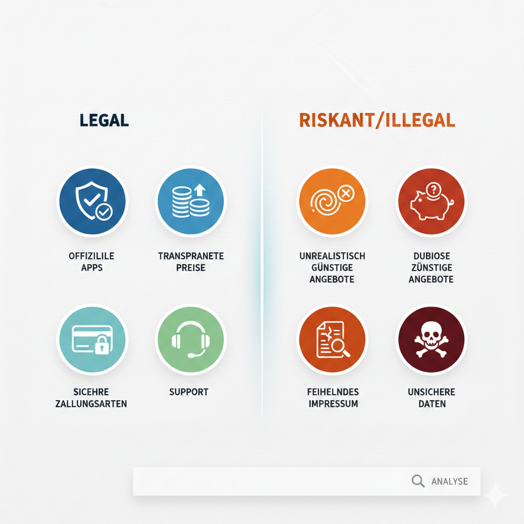 Legalität erkennst du an Transparenz: Unternehmen, Kontakt, klare AGB, nachvollziehbare Inhalte.